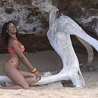 The beautiful mixed girl plays with an old tree on a carribbean beach.