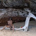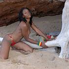 The beautiful mixed girl plays with an old tree on a carribbean beach.