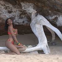 La belle caribéenne joue sur une plage et s'expose pour notre plaisir.