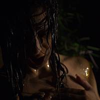 Une jeune fille brune avec une jolie poitrine joue dans la chaleur du soir