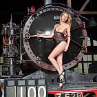 La jolie et frĂȘle blondinette joue sur un monstre d'acier