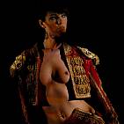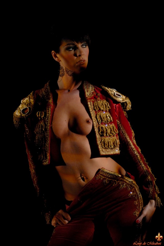 Under the applause of the crowd, the beautiful bullfighter plays with her perfect body in the evening heat