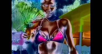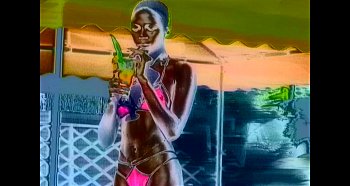 Voici la belle Kenia buvant un cocktail au bord d'une piscine tropicale. c'est un test d'effets !