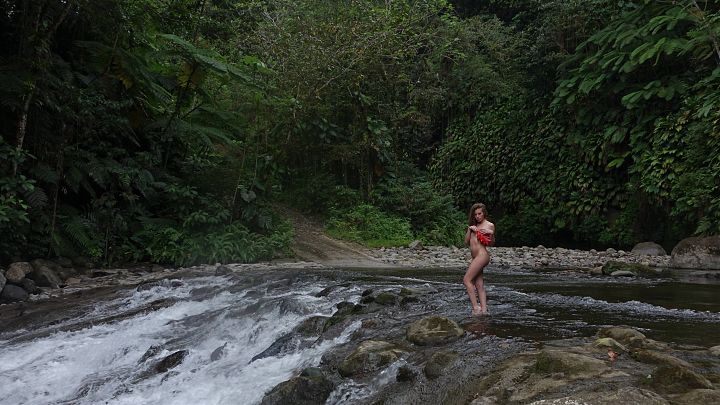 Katia se rafraîchit dans le courant d'une cascade caribéenne !