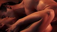 The young beautiful couple continues the love scene in the evening heat