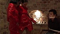 In front of a poor guy tied up like a sausage and with the look of a dead cow, the two lovely little girls wrestle in an old cellar.