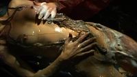 The incredible length of the hair of the pretty brunette surprise you.