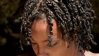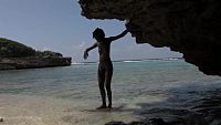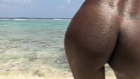 After a video session on a dream beach, the beautiful black girl poses for a photo shoot