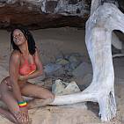 The beautiful mixed girl plays with an old tree on a carribbean beach.