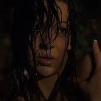Une jeune fille brune avec une jolie poitrine joue dans la chaleur du soir