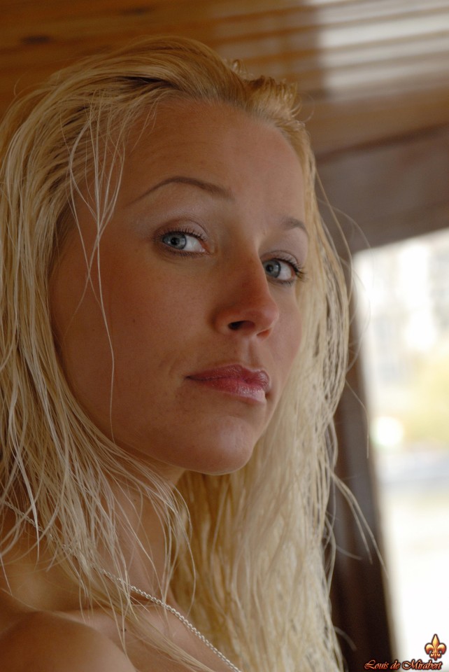 The gorgeous blonde girl boarded a barge for a photo shoot, She took the bar and watch naked in front of the Eiffel Tower