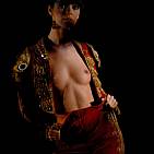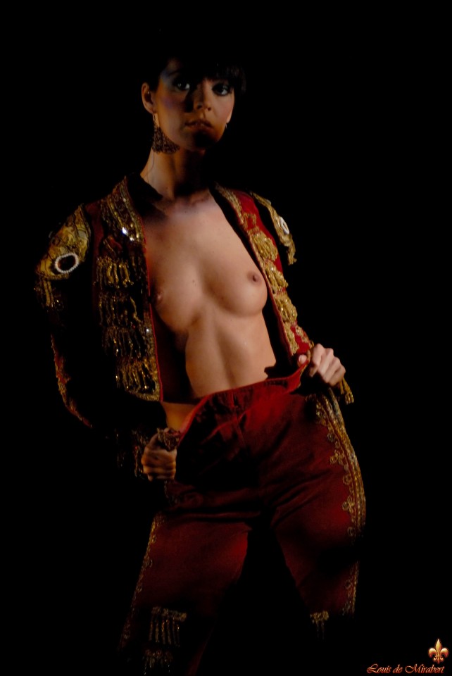 Under the applause of the crowd, the beautiful bullfighter plays with her perfect body in the evening heat
