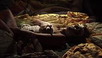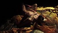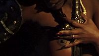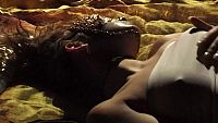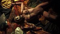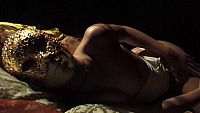 La belle inconnue masquée, dans une chambre tendue de brocarts d'or et d'argent, se caresse doucement et sensuellement pour atteindre les sommets du "plaisir"
